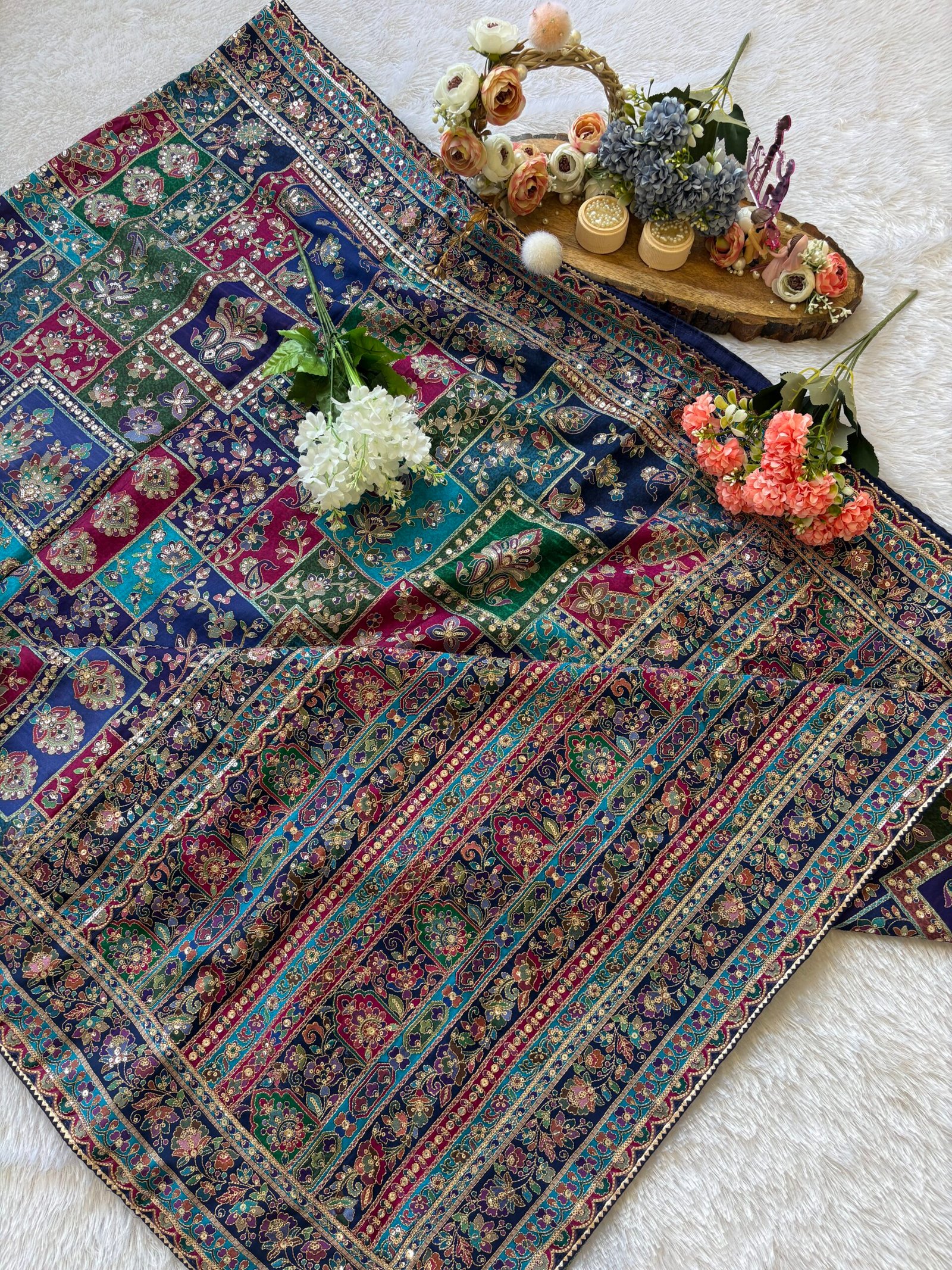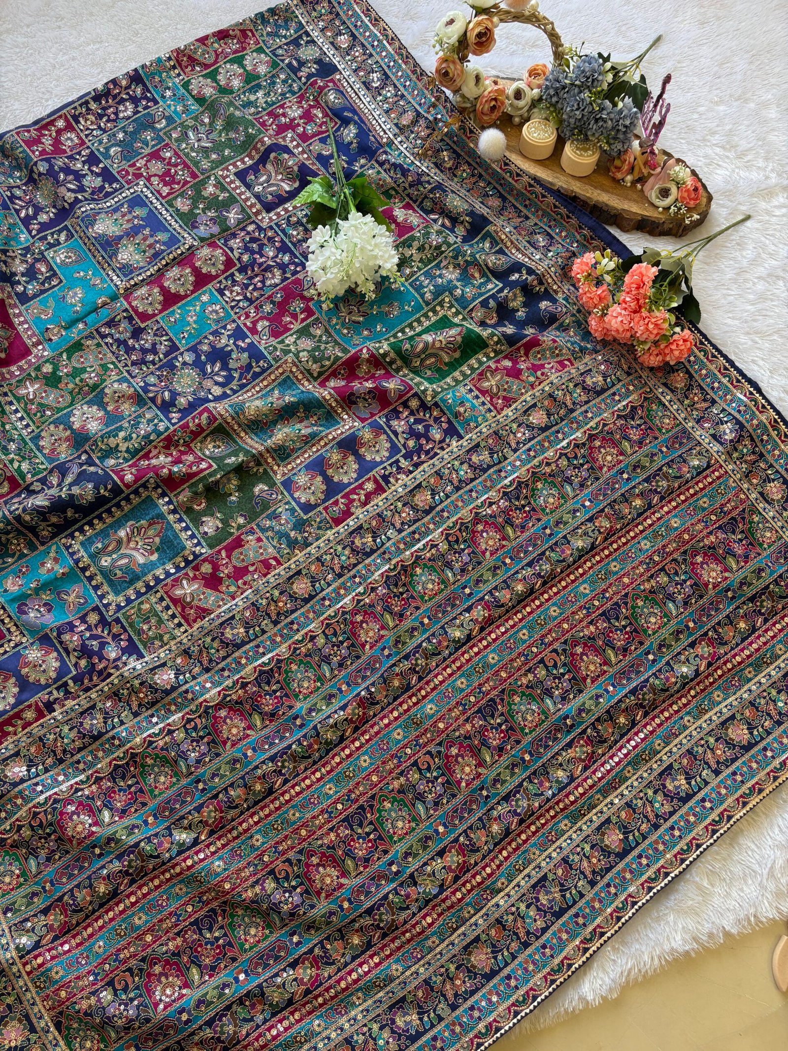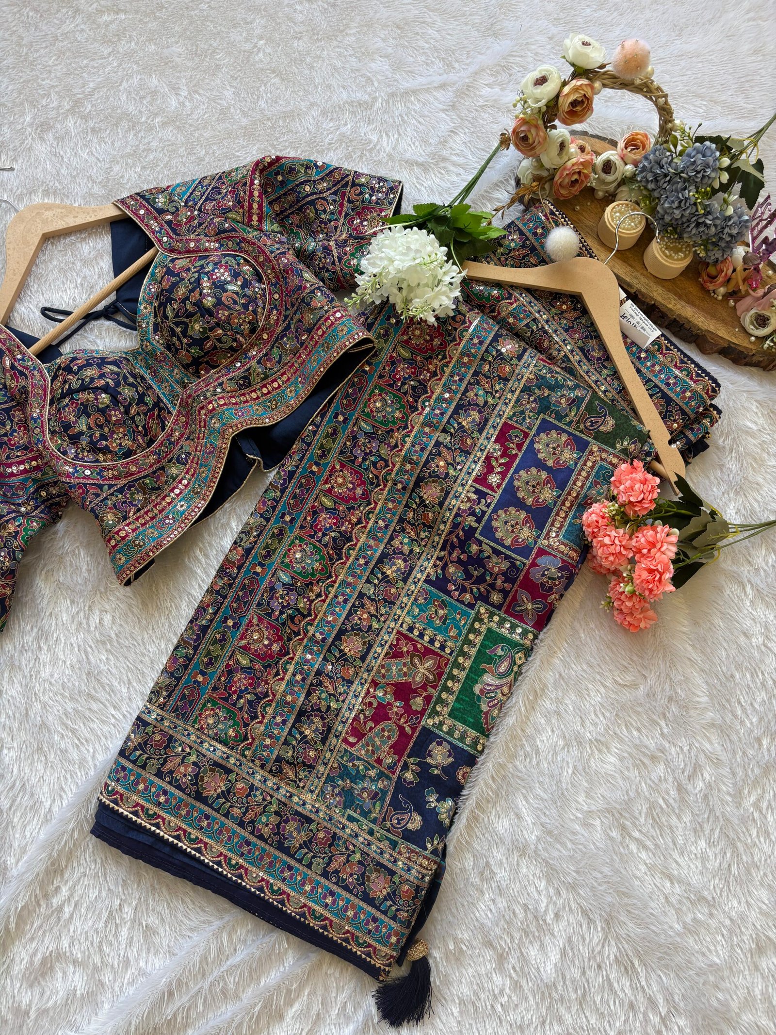 Blue Royal Multi color Silk Saree with Intricate Floral Embroidery