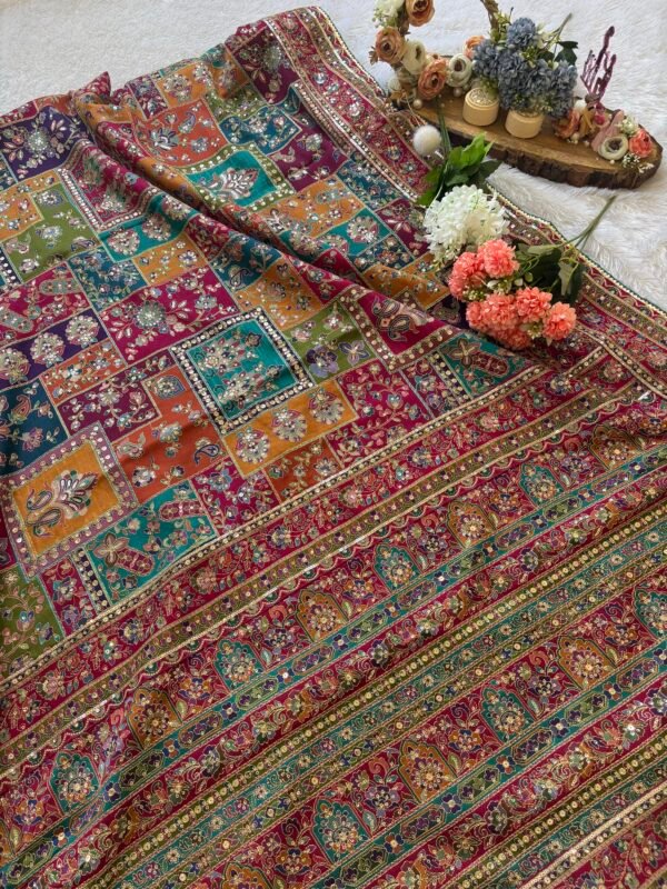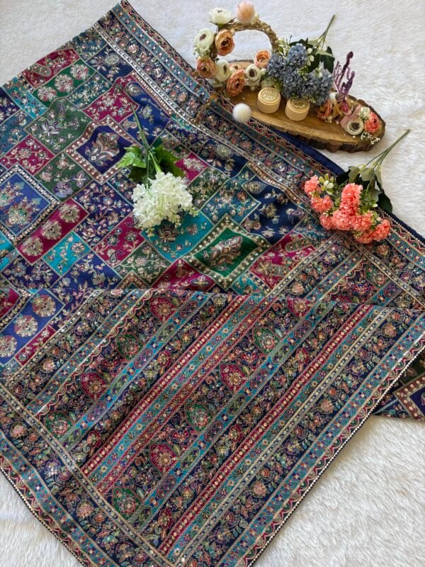The saree showcases vibrant patch-style panels in royal blue, magenta, green & turquoise tones, enriched with delicate zari & sequin detailing.
