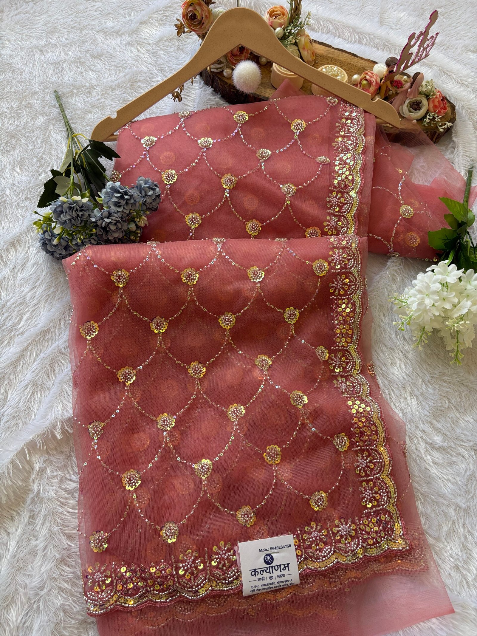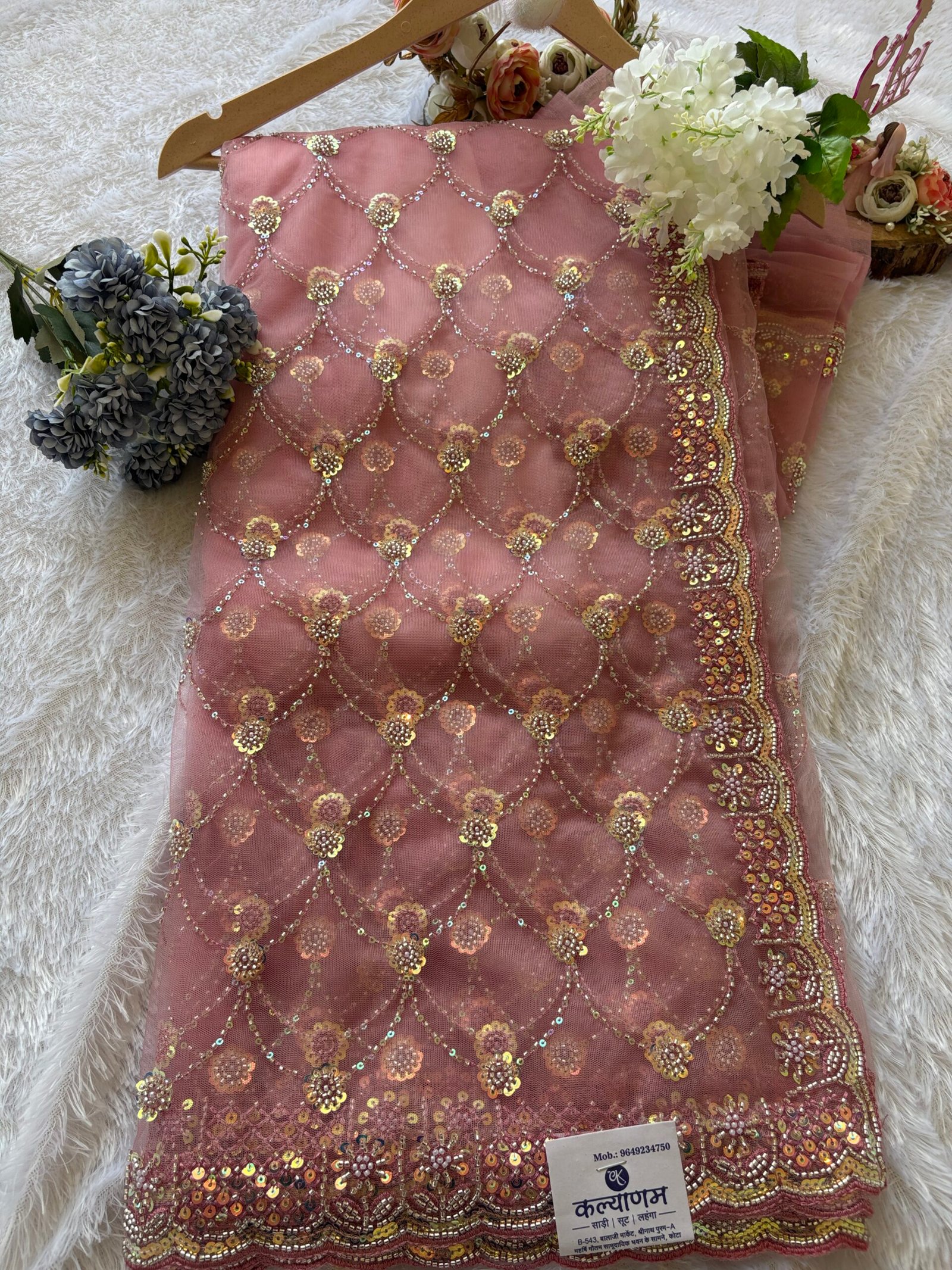 Add elegance to your wardrobe with this beautifully designed net saree featuring intricate sequin floral jaal work and a rich scallop border. Perfect for weddings, parties, and festive occasions, this saree offers a graceful and glamorous look.
