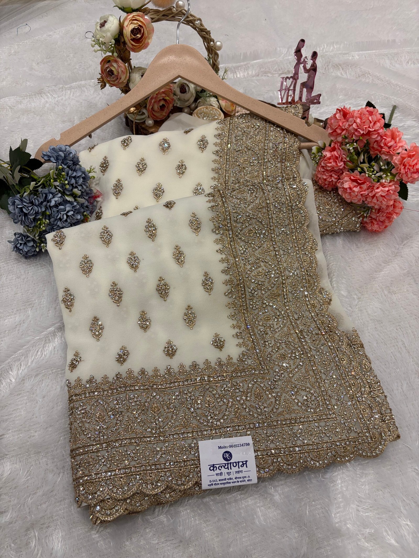 The premium georgette fabric ensures a soft, flowy drape with a graceful fall, while the heavy craftsmanship adds a statement look perfect for weddings, receptions, and grand celebrations. Whether you choose classic red or elegant ivory, this saree is designed to make you stand out effortlessly.