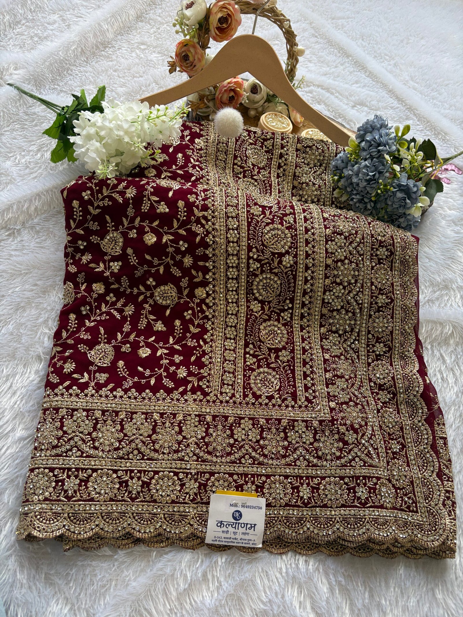 This saree features elegant floral and traditional motifs all over, paired with a heavily embroidered border and pallu that gives a complete royal bridal look. The lightweight georgette fabric ensures graceful draping while maintaining a luxurious appearance.